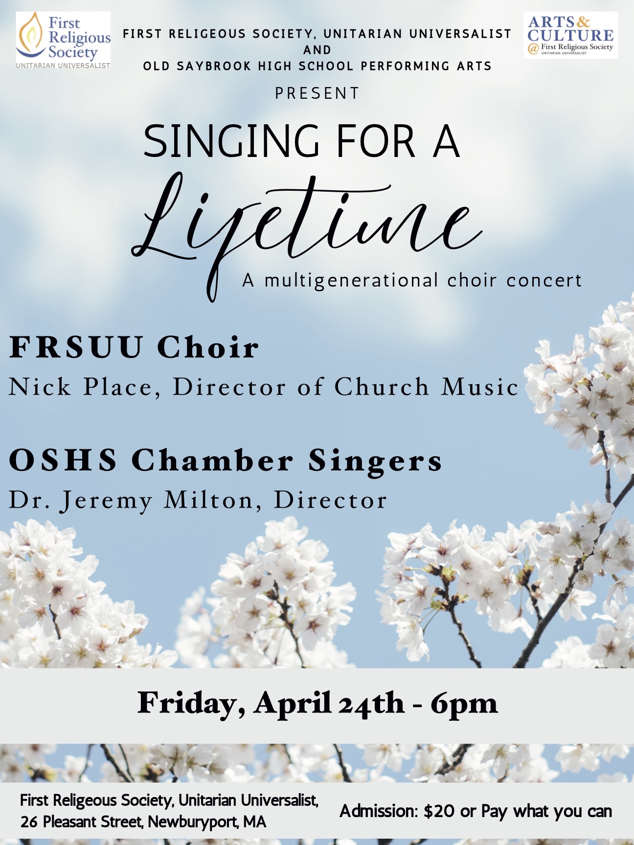Friday, April 24, Sanctuary, 6pm-7pm Join the FRSUU Choir and the Old Saybrook High School Chamber Singers for a concert of inspirational music. $20 tickets at the door